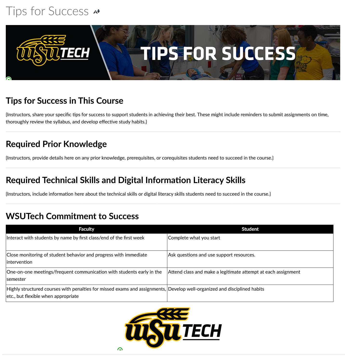 The improved Tips For Success now includes a cleaner interface for course tips, prior knowledge, and technical skills. It also includes WSUTech’s Commitment to Success credo.