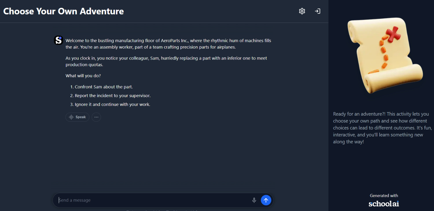 In this Substack we would like to showcase ITAS Instructional Designer Kristy Duggan’s Work Ethics: Choose Your Adventure course activity that uses SchoolAI to create a personalized chatbot. (SchoolAI is free for teachers.) This particular chatbot provides project knowledge and feedback scenarios based on small aircraft manufacturing, guiding students through various workplace challenges. A custom Adventure Scenario can be created for any discipline. The instructor can track each student’s dialogue depth, responses, and prompts used. They can even see how deep into the Adventure each student explored. This feature can embed directly into Canvas.